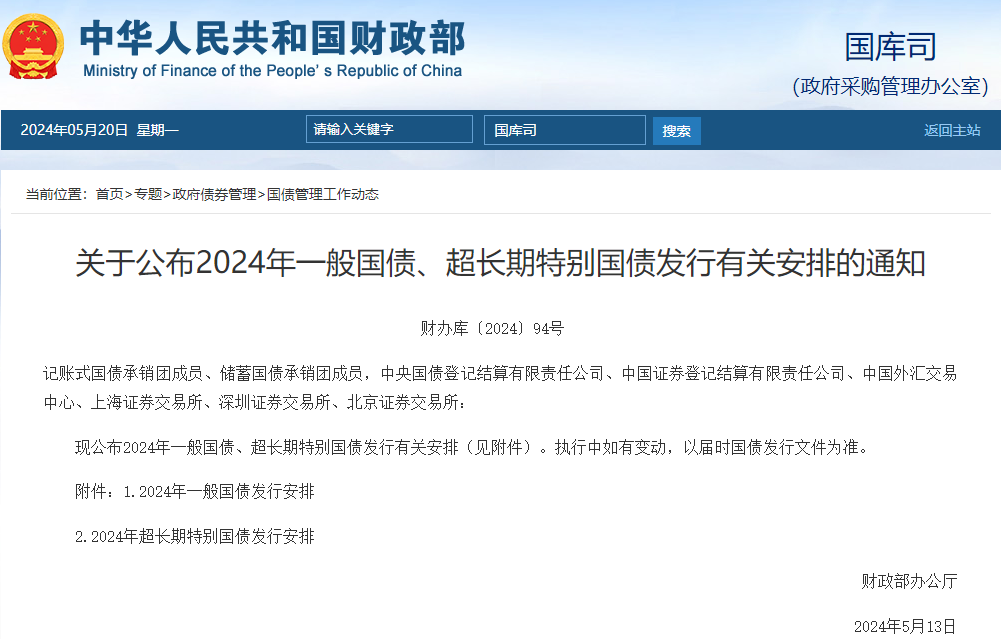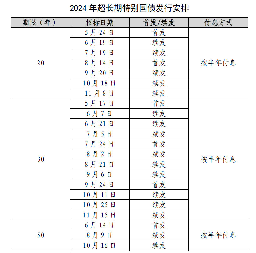 财政部办公厅5月13日公布了2024年一般国债、超长期特别国债发行有关安排的通知。按照安排,超长期特别国债期限包括20年期、30年期、50年期,付息方式均为按半年付息,首次发行时间为5月17日。