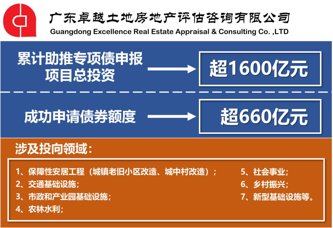 广东卓越土地房地产评估咨询有限公司通过专业技术服务,助力广东省内地方政府部门提前谋划,科学统筹每一轮专项债及专项借款项目前期梳理、布局、立项和申请发债等工作。目前,已在广州、佛山、珠海、东莞、梅州、茂名等多个城市协助地方政府开展专项债申报工作,累计助推专项债申报项目总投资超1600亿元,其中申请债券金额超660亿元,项目涉及投向领域涵盖保障性安居工程(城镇老旧小区改造、城中村改造)、交通基础设施、市政和产业园基础设施、农林水利、社会事业、乡村振兴、新型基础设施等多个领域。