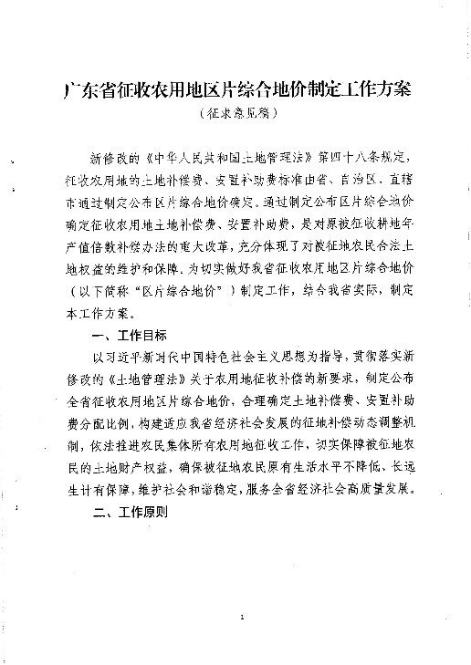 自然资源部提出加快推进区片综合地价制定工作,发布《自然资源部办公厅关于加快制定征收农用地区片综合地价工作的通知》(自然资办发〔2019〕53号)文件,指示“各地要立足现有工作基础,对照新的规定要求,改进技术方法,加快推进区片综合地价制定工作。”广东省紧跟部的文件要求,加快推动工作,发布《广东省征收农用地区片综合地价制定工作方案》(征求意见稿),要求“2020年1月15日前,各市、县(市、区)要完成区片综合地价测算且进行充分论证,并由各地级市自然资源主管部门对各县(市、区)初步成果进行审查、调整和市域内平衡,以及与《广东省征地补偿保护标准(2016年修订调整)》的衔接,形成市级“一表一图一报告”成果,报同级人民政府同意后,以地市为单位将全市初步成果报省自然资源厅。”
