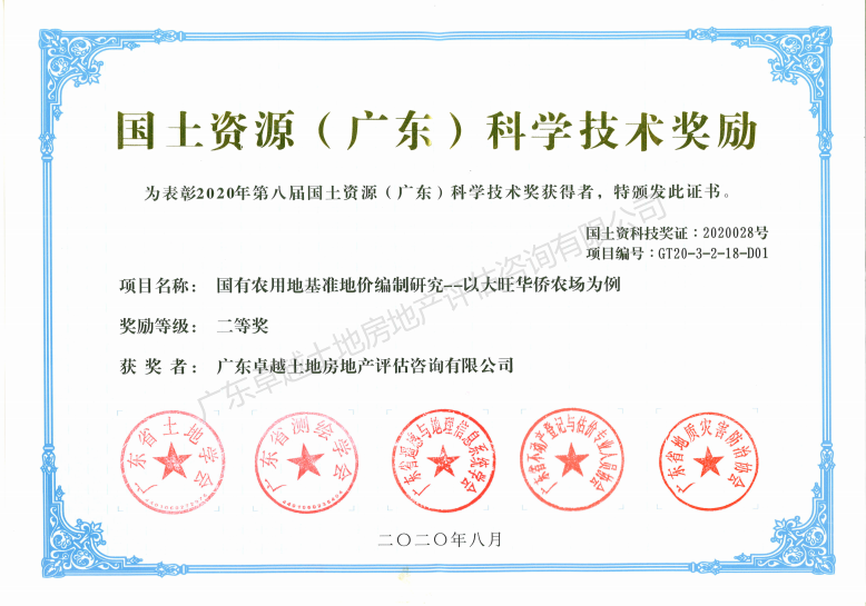 2020年8月,在国土资源(广东)科学技术奖评审办公室公布的《关于表彰第八届国土资源(广东)科学技术奖优秀项目的决定》中,广东卓越土地房地产评估咨询有限公司(简称“卓越评估”)完成的《国有农用地基准地价编制研究——以大旺华侨农场为例》荣获第八届国土资源(广东)科学技术奖二等奖。