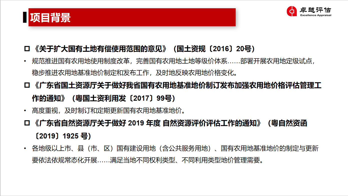 卓越评估自2006年起涉足并深入扎根于公示地价评估领域,目前已覆盖广东省近四十个市、县(区)。卓越评估以大旺华侨农场国有农用地为研究对象,致力于分析影响大旺华侨农场国有农用地及国有宜农未利用地土地经济利用的影响因素及使用价值的空间分布等利用状况,通过制订合理的、现势的、实用的国有农用地基准地价,为大旺华侨农场国有农用地出让、租赁、作价出资或者入股、授权经营等价值评估行为提供参考。经过应用该创新方式和手段,本项目一共完成710个土地定级单元,土地总面积约1907.04公顷土地的定级估价。