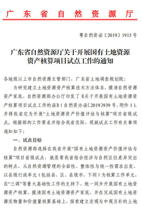 自然资源部办公厅在文件(自然资办函〔2019〕939 号)中明确提出将广东省作为省级试点地区之一,广东省自然资源厅在文件(粤自然资函〔2019〕1915 号)也明确提出,全省 21 个地级市需在 2019 年 11 月 30 日前向省厅提交宏观尺度土地资源资产核算成果,珠三角 9 市需在 2020 年 3 月 15 日前向省厅提交中观尺度土地资源资产核算成果。因此,试点工作的开展迫在眉睫,刻不容缓。