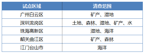 试点区域为广州市白云区、深圳市龙岗区、珠海市高新区、韶关市曲江区、江门台山市,清查范围包括土地、矿产、森林、湿地、海洋和水等全民所有自然资源资产。
