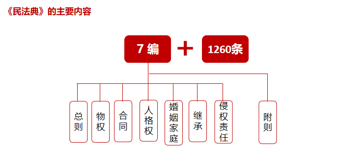 《民法典》被称为“社会生活的百科全书”,是新中国第一部以法典命名的法律,在法律体系中居于基础性地位,也是市场经济的基本法。《民法典》共7编、1260条,各编依次为总则、物权、合同、人格权、婚姻家庭、继承、侵权责任,以及附则。