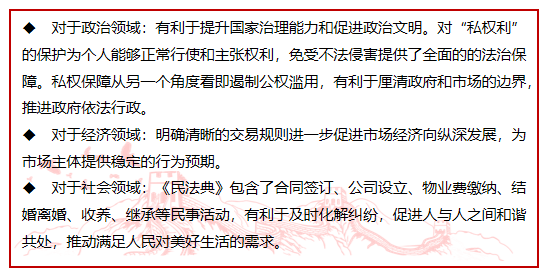 《民法典》开创了我国法典编撰立法的先河,是坚持和完善中国特色社会主义制度的现实需要;是推进全面依法治国、推进国家治理体系和治理能力现代化的重大举措;是坚持和完善社会主义基本经济制度、推动经济高质量发展的客观要求;是增进人民福祉、维护最广大人民根本利益的必然要求。《民法典》在政治、经济、社会等领域都将产生深远的影响。