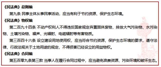 在《民法典》“第一编 总则”中,明确规定:民事主体从事民事活动,应当有利于节约资源、保护生态环境。同时,在物权编第二百九十四条和第三百四十六条、合同编第五百零九条中,都对节约资源和保护生态环境提出了要求。“绿色原则”的确立,有力地促进了全社会保护生态环境,节约集约利用资源,也为依法追究各类损害生态环境和自然资源的行为提供法律依据。