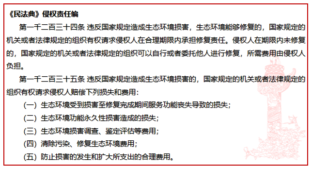 《民法典》侵权责任编的第七章在《侵权责任法》“第八章 环境污染责任”的基础上,补充修改为“环境污染与生态破坏责任”。该章的亮点是明确了追究生态环境损害赔偿责任的方式和内容,并明确了赔偿损失和费用内容,为健全完善生态环境损害赔偿制度提供了法制保障。