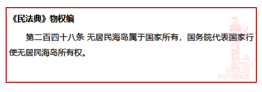 《民法典》坚持贯彻落实完善产权保护制度的要求,在《物权法》中属于国家所有的基础上,增加第二百四十八条,明确无居民海岛属于国家所有,国务院代表国家行使无居民海岛所有权,为保护海岛及其周边海域生态系统提供了法律依据,也体现了国家坚决维护国家海洋权益,对促进海岛经济社会的可持续发展具有重大意义。