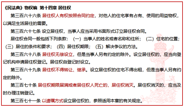 《民法典》在物权编新增“第十四章 居住权”专章,旨在构建更加合理的住房保障制度。在第三百六十六条至第三百七十一条中可以看到,居住权可通过合同或遗嘱的方式无偿设立,不得转让和继承。