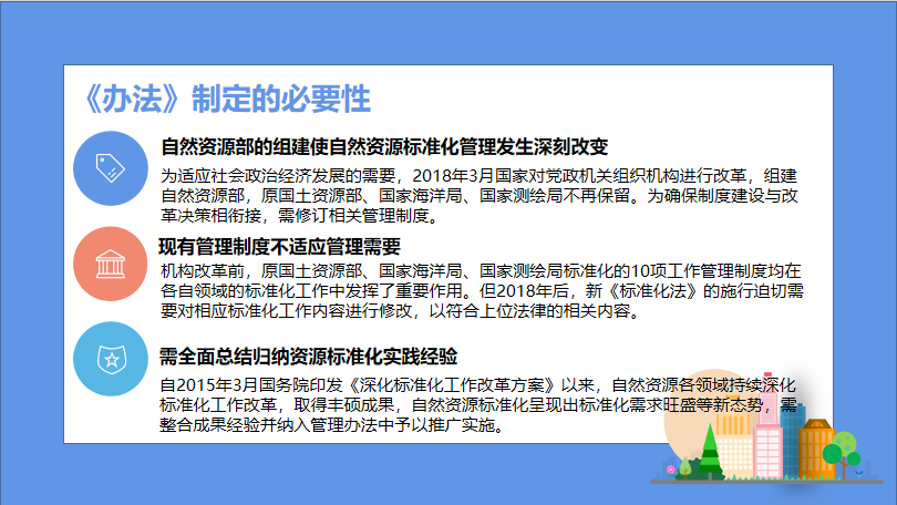 近日,在整合原国土资源部、国家海洋局、国家测绘局有关标准化管理制度的基础上,自然资源部进一步优化形成《自然资源标准化管理办法》(以下简称《办法》),并予以发布施行,旨在通过发挥标准化对自然资源事业达到支撑保障作用,从而促进自然资源标准化工作高效、协调有序发展。