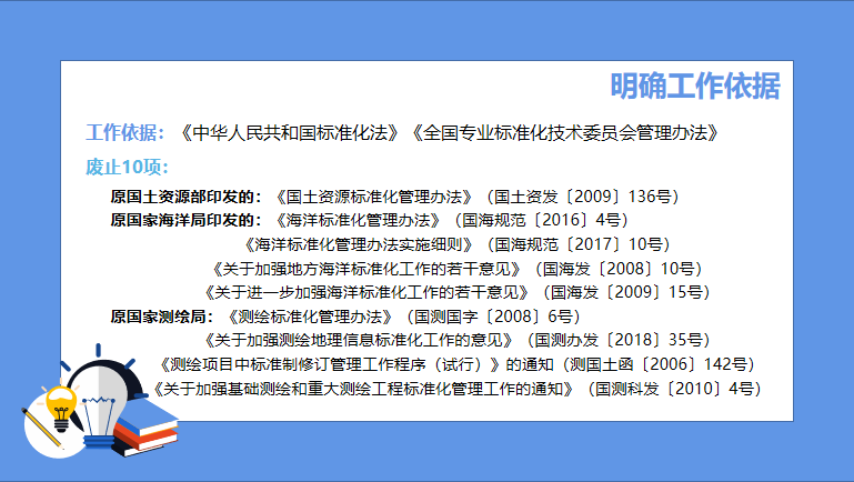 本次《办法》依据《中华人民共和国标准化法》《全国专业标准化技术委员会管理办法》及相关规定制订,并自颁布之日起施行,原国土资源部、国家海洋局、国家测绘局在标准化的10项工作管理制度自行废止。