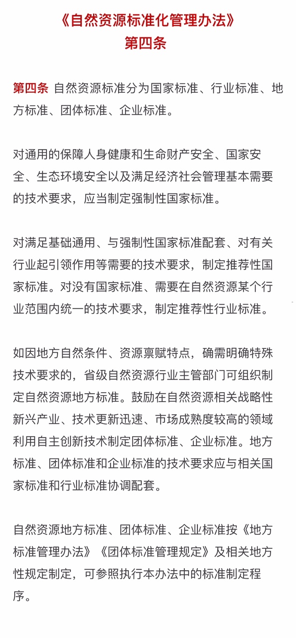 《办法》第四条明确提出,自然资源标准分国家标准、行业标准、地方标准、团体标准、企业标准。同时,根据不同的技术要求,制定强制性、推荐性等标准。
