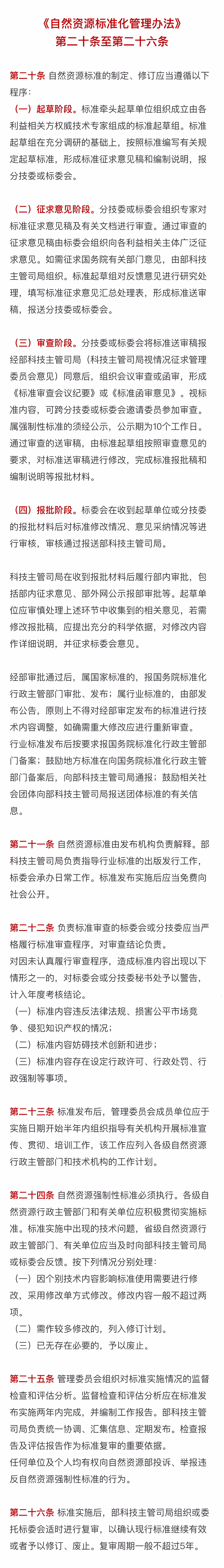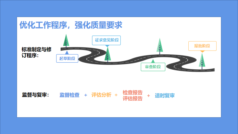 《办法》明确,自然资源标准的制定、修订应当遵循第二十条的程序规定,包括起草阶段——征求意见阶段——审查阶段——报批阶段。同时,《办法》强化实施监督,实行“监督检查+评估分析+工作报告+适时复审”的监督方式,严格保障标准质量与效用。
