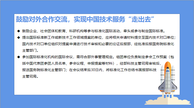 《办法》把促进科技进步、技术融合与成果转化作为价值取向,积极推动标准化对外的合作和交流。同时明确规定了国际标准新工作或新技术工作领域提案的申请及参与国际标准化机构国际会议工作预案的工作程序。