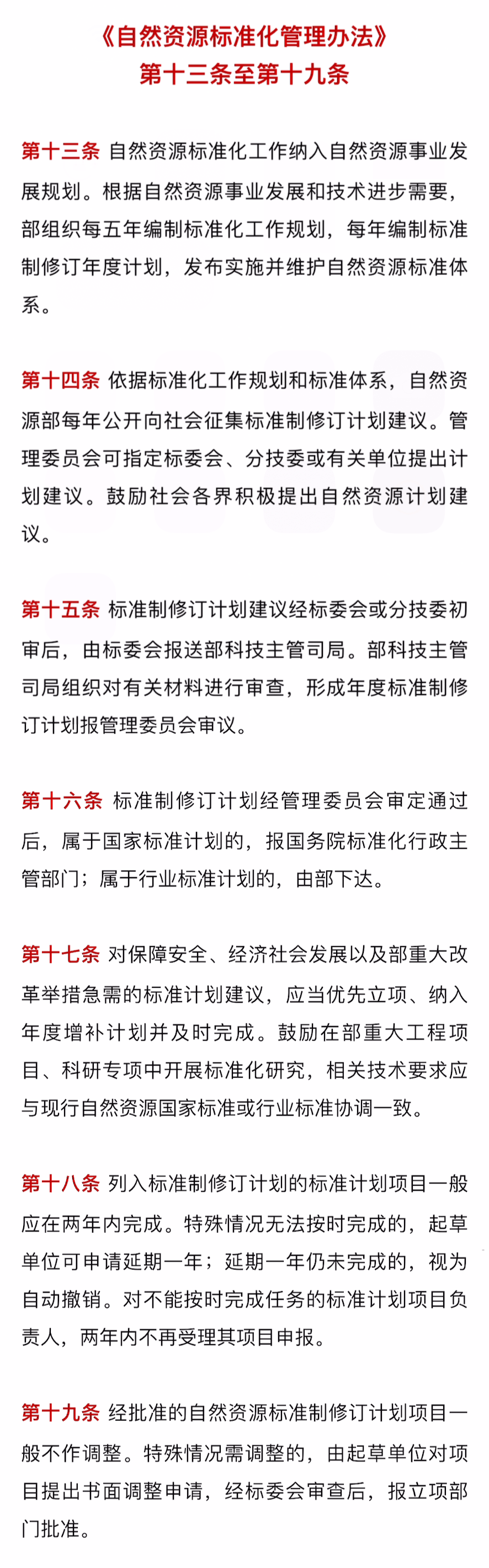 自然资源标准化工作实行自上而下的统一谋划,将自然资源标准化工作纳入自然资源事业发展规划,每年编制标准制修订计划,并秉持共商共治的开放原则,鼓励社会各界积极提出自然资源计划建议。