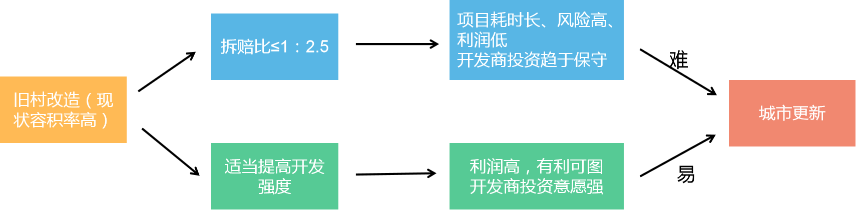 城市更新容积率低制约土地价值释放,城市更新项目特别是旧村居改造项目,现状容积率往往都偏高,而控规可以落实的容积率与现状容积率相差不大,导致项目拆赔比偏低(拆赔比低于1:2.5的项目经济账基本上很难做到平衡),项目利润微乎其微,而城市更新项目耗时较长、资金沉淀时间也长,偏高的风险和偏低的利润容易导致投资商趋于保守。城市更新的目的是新增建设用地指标不足以支撑城市发展,需要盘活存量建设用地指标,但是如果改造后的容积率偏低的话,完全达不到旧改的初衷。