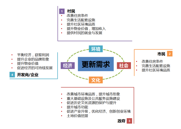 城市更新是城市可持续发展的一种重要方式,但随着城市的发展会暴露城市更新进程中许多矛盾和问题,如产业产能低、耗能大,旧村改造各方主体利益难以平衡等,影响了城市的健康持续发展。为此,城市决策者针对这些矛盾和问题出台了相应的城市更新新政策。
